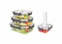 Sada skleněných vakuovacích dóz pro uchování potravin déle čerstvých. Vakuovací pumpa v balení. 4 dózy s víky ve 4 velikostech. Tepelně odolné sklo vhodné i pro zapékání či mražení.