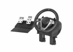 Herní volant Genesis Seaborg 400 s pedály, zpětnou vazbou a 15 tlačítky. Nastavitelný rozsah otáčení 270–900°, řazení pod volantem, USB připojení a kompatibilita s PC. Stabilní konstrukce, vibrační motory a realistické ovládání pro závodní hry.