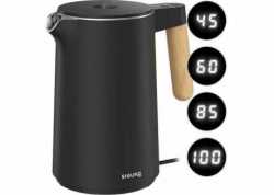 Rychlovarná konvice s regulací teploty a dvojitým opláštěním. Displej, ovládání na těle konvice, 1,5 l kapacita, výkon 2200 W.