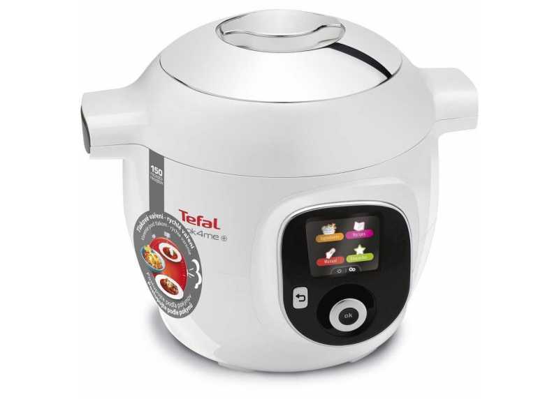 Tefal CY851130 Cook4Me multifunkční hrnec 6 l, příkon 1 600 W, tlakové vaření, vaření v páře, pečení i smažení, automatické programy, displej, časovač, odložený start, udržení teploty, vyjímatelná nádoba, termostat, napařovák v balení, bílá barva.