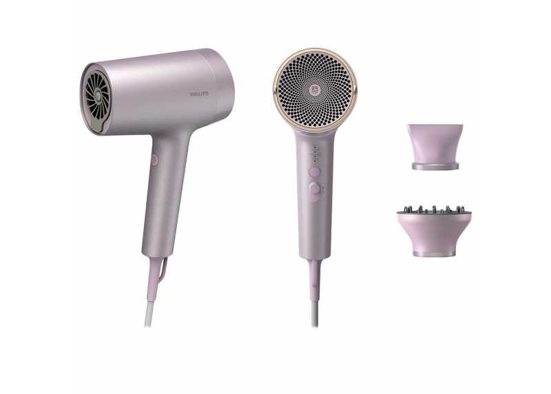 Fén na vlasy s Philips 7000 BHD723/10 s příkonem 1800 W, napětím 220-240 V, 2 rychlostmi, 4 možnostmi nastavení teploty, koncentrátorem, difuzérem a ionizátorem.
