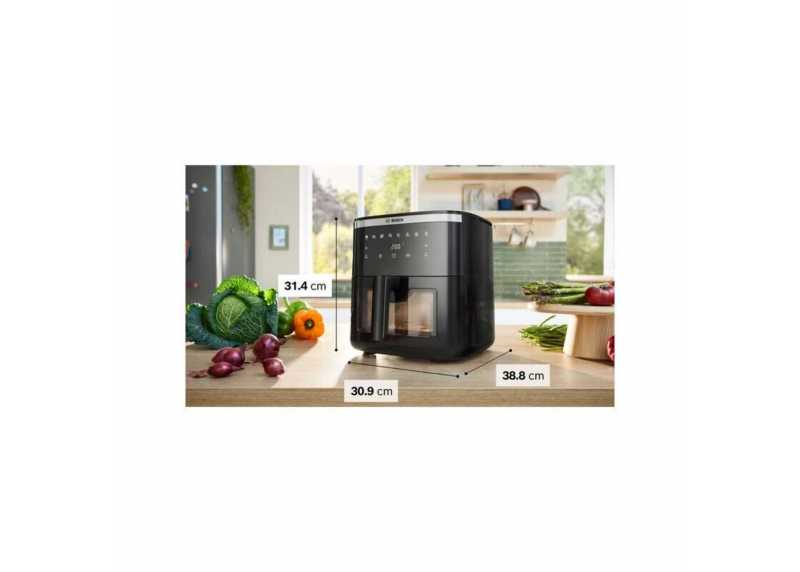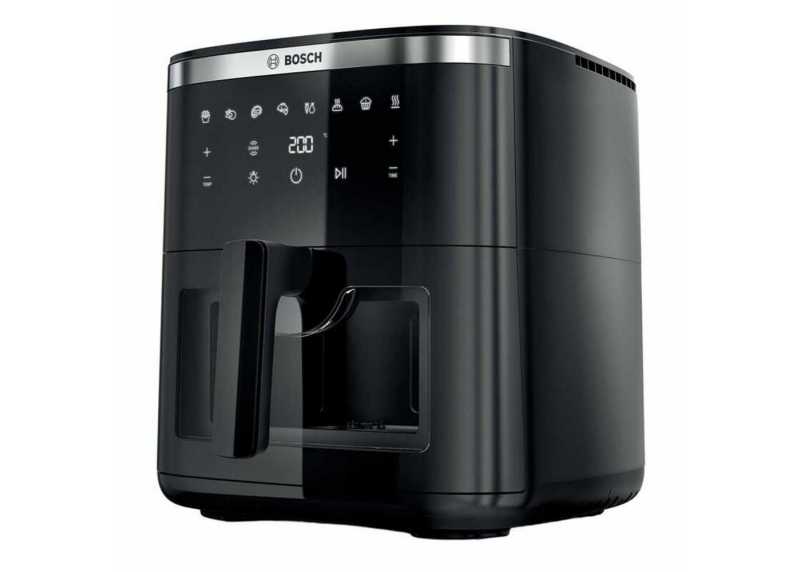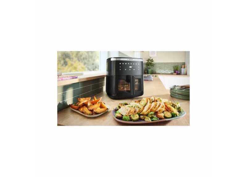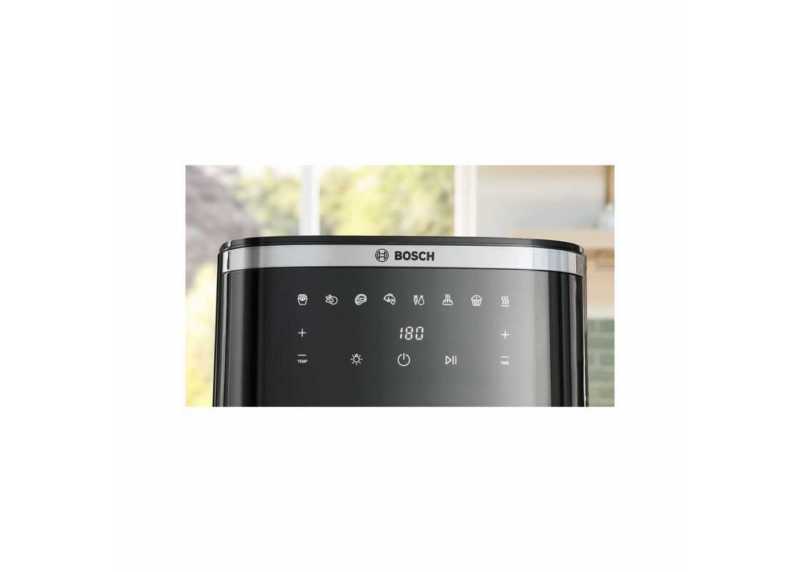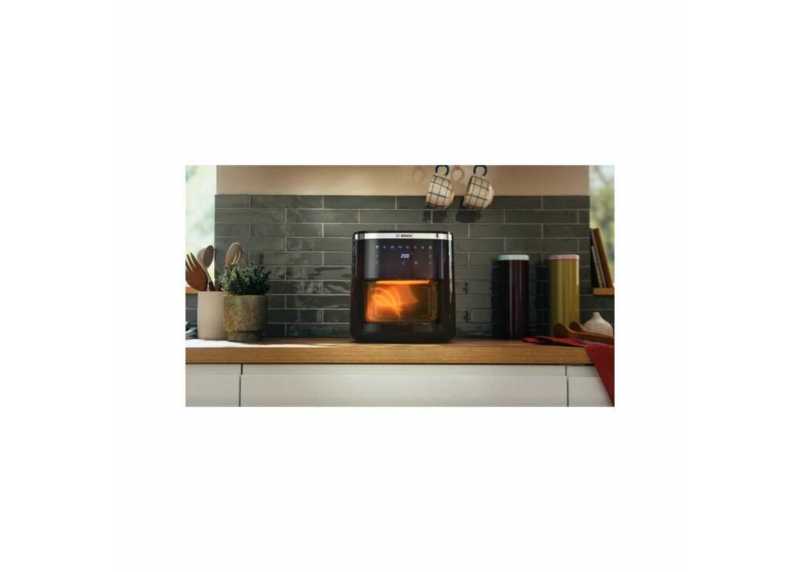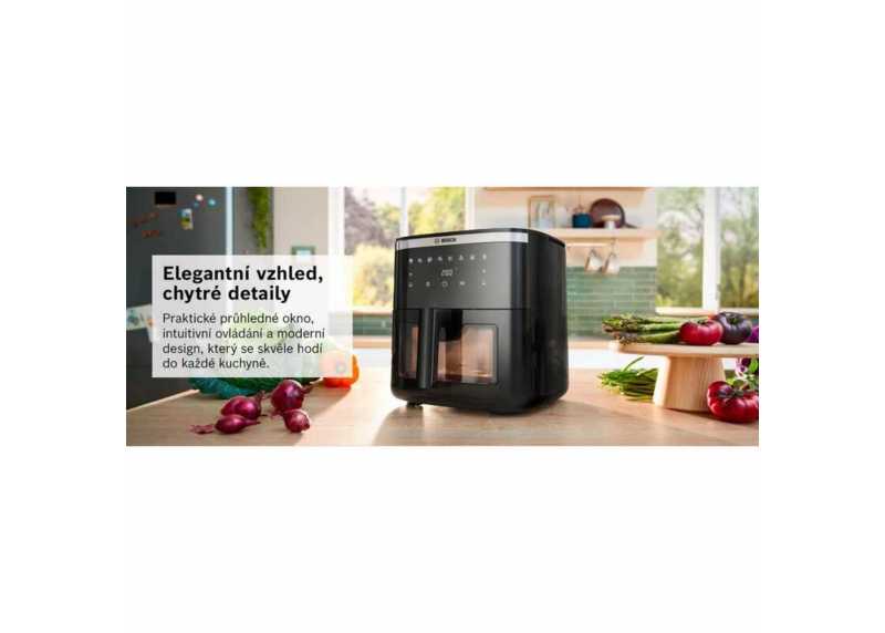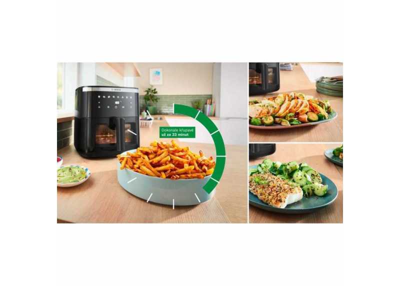 Horkovzdušná fritéza Bosch Serie 6 MAF671B0, příkon 1800 W, objem 7,2 l až pro 5 porcí, dotykový displej, regulace 40–200 °C, 8 programů, průhledné okénko s osvětlením, Shake alarm, nepřilnavý koš, bez nutnosti předehřívání, snadná údržba a zdravé smažení s minimem oleje.