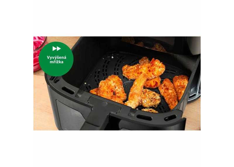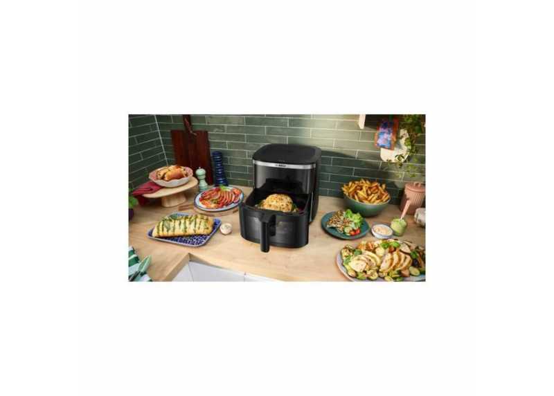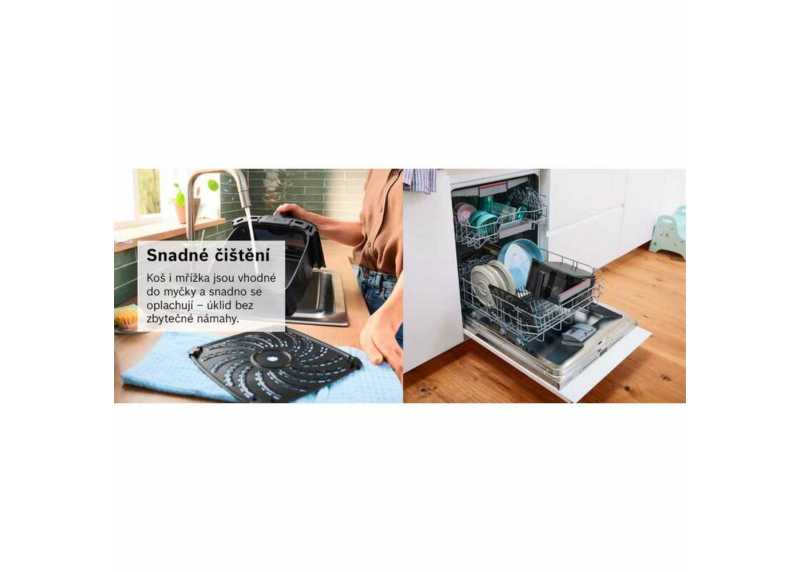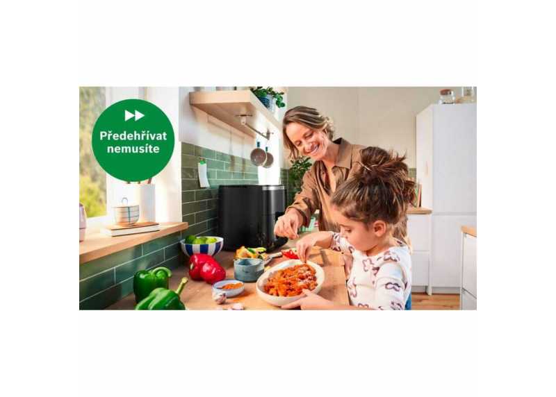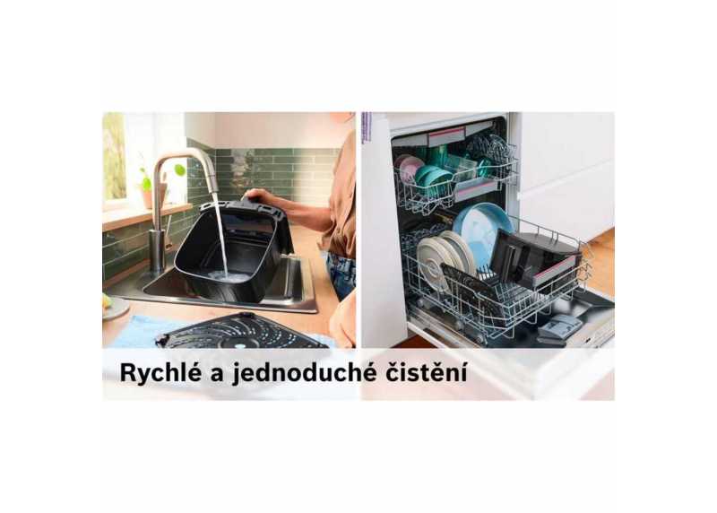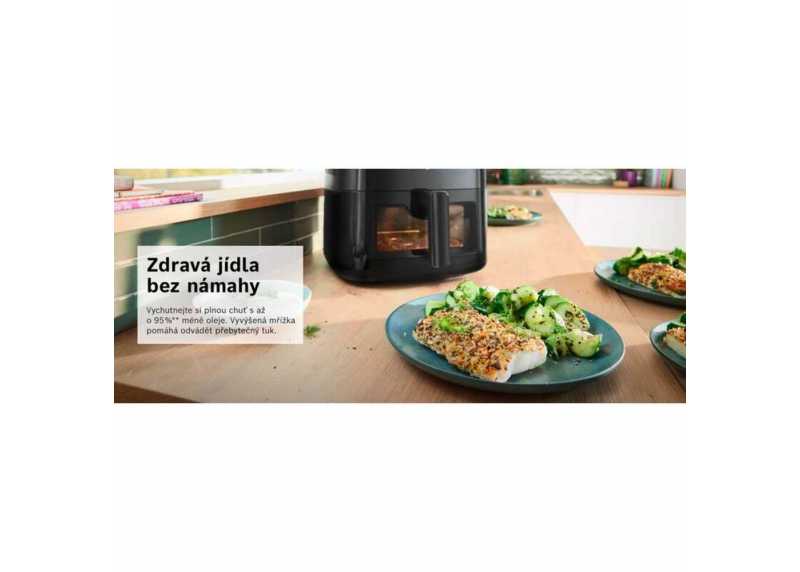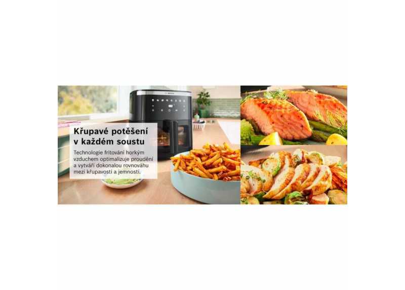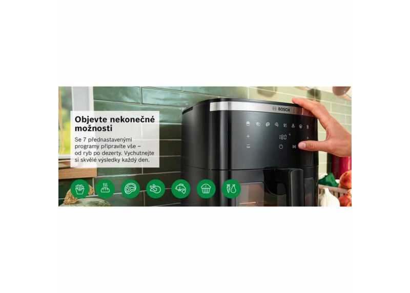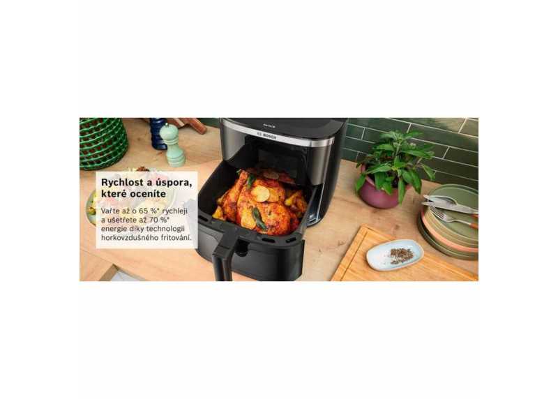 Horkovzdušná fritéza Bosch Serie 6 MAF671B0 přináší moderní způsob přípravy oblíbených jídel rychleji, zdravěji a pohodlněji. Díky velkému objemu 7,2 litru připravíte pokrmy pro celou rodinu nebo návštěvu najednou. Intuitivní ovládání, automatické programy a průhledné okénko s osvětlením zajistí perfektní kontrolu nad přípravou jídla. Ideální řešení pro každodenní vaření, zdravý životní styl i slavnostní příležitosti. Fritéza Bosch Serie 6 MAF671B0 kombinuje vysoký výkon, velký objem a pokročilé funkce pro maximální komfort při přípravě jídla. S výkonem 1800 W a technologií horkého vzduchu připravíte pokrmy rychle a s minimem oleje. Dotykové ovládání, přednastavené programy a velké průhledné okénko zajišťují perfektní kontrolu i snadné použití každý den.