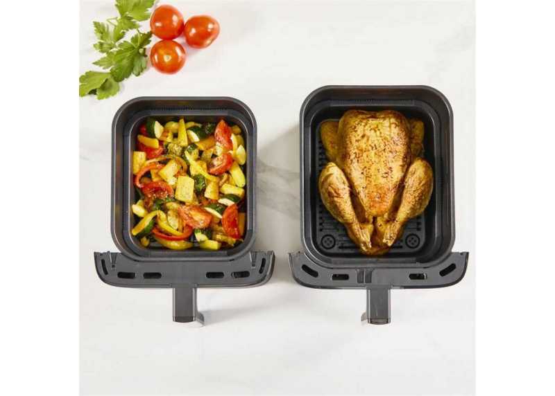 Horkovzdušná fritéza 2700 W, objem 10 l (4 l + 6 l), 6 programů, duální koše, synchronizace vaření, dotykový displej a technologie EvenFry pro křupavé výsledky.