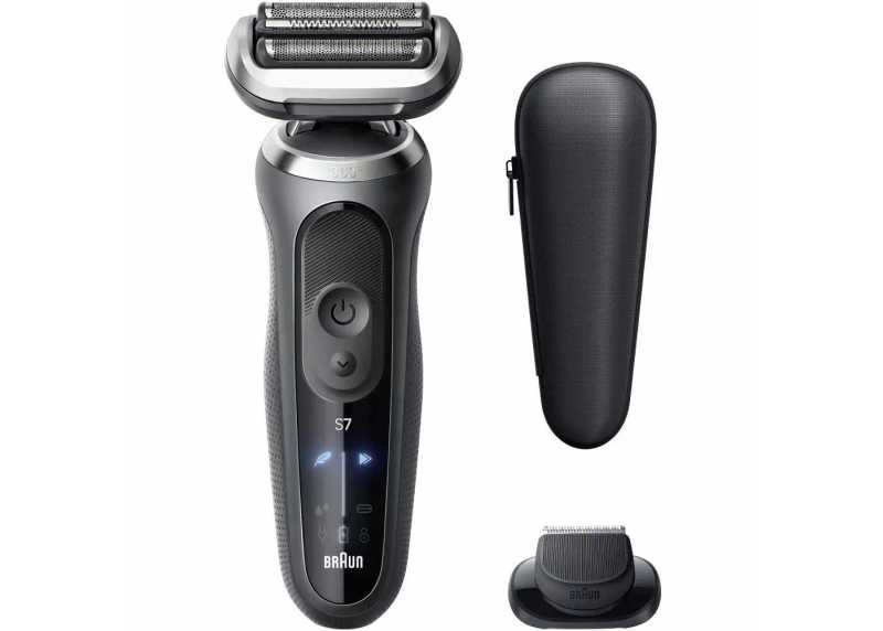 Pánský planžetový holicí strojek Braun Series 7 pro suché i mokré holení s flexibilní 3břitovou hlavou, zastřihovačem a výdrží baterie až 60 minut.