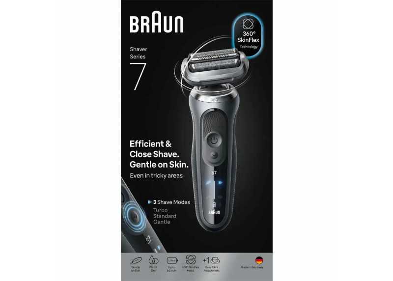 Braun Series 7 nabízí tři režimy – Turbo, Standardní a Jemný. Hlavice 360° SkinFlex a břity Flex plynule kopírují obličej a zajišťují hladké, rychlé a šetrné oholení.