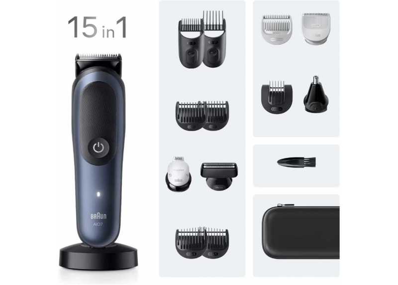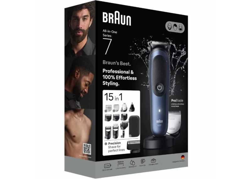 Pánský profesionální zastřihovač Braun Series 7 AIO7580 15v1 nabízí kompletní úpravu od hlavy až k patě. Díky ostrým břitům ProBlade, technologii AutoSense a 14 nastavením délky střihu 0,5–21 mm zvládne vousy, vlasy i tělo s maximální přesností a pohodlím.