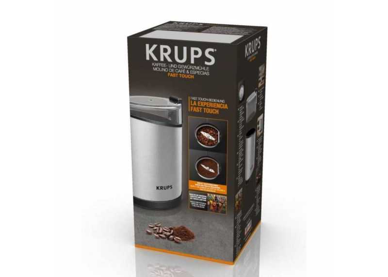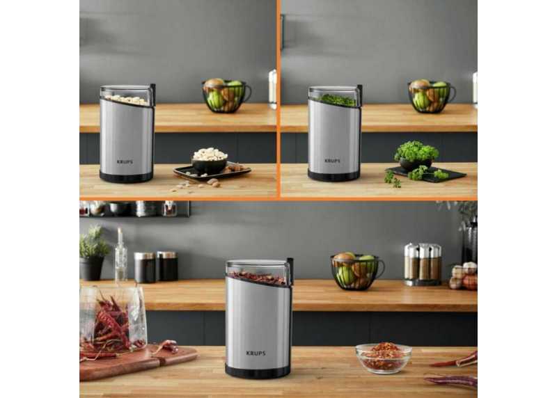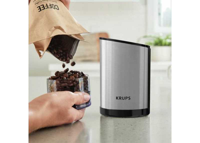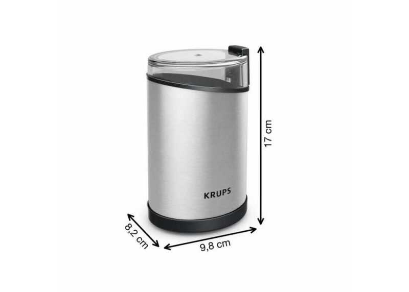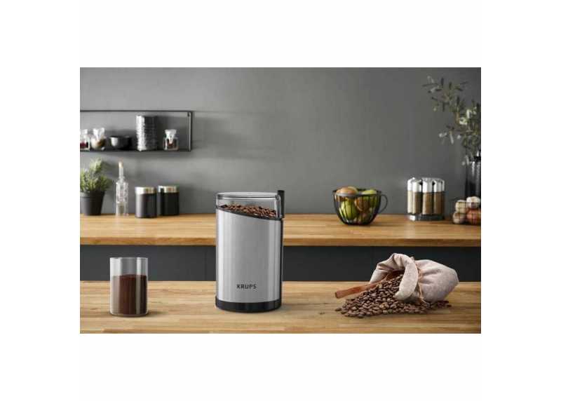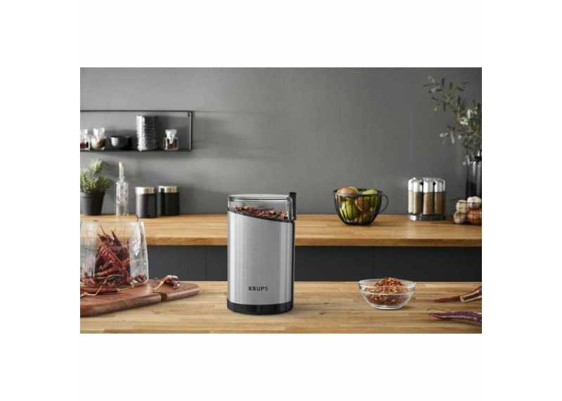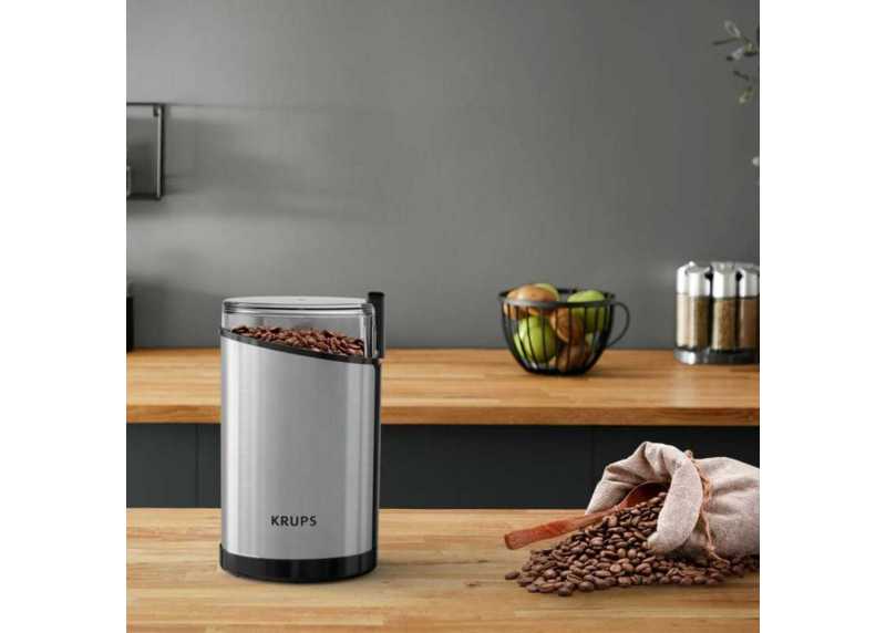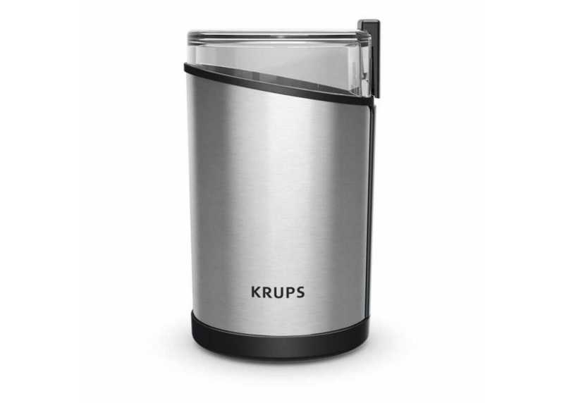 Kompaktní mlýnek Krups s výkonem 200 W, nerezovými noži a kapacitou 85 g zvládne kávu, koření i bylinky rychle a bez námahy.