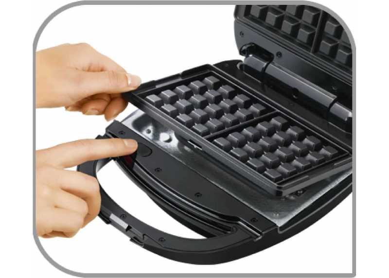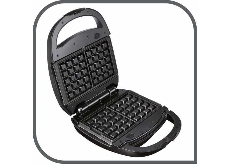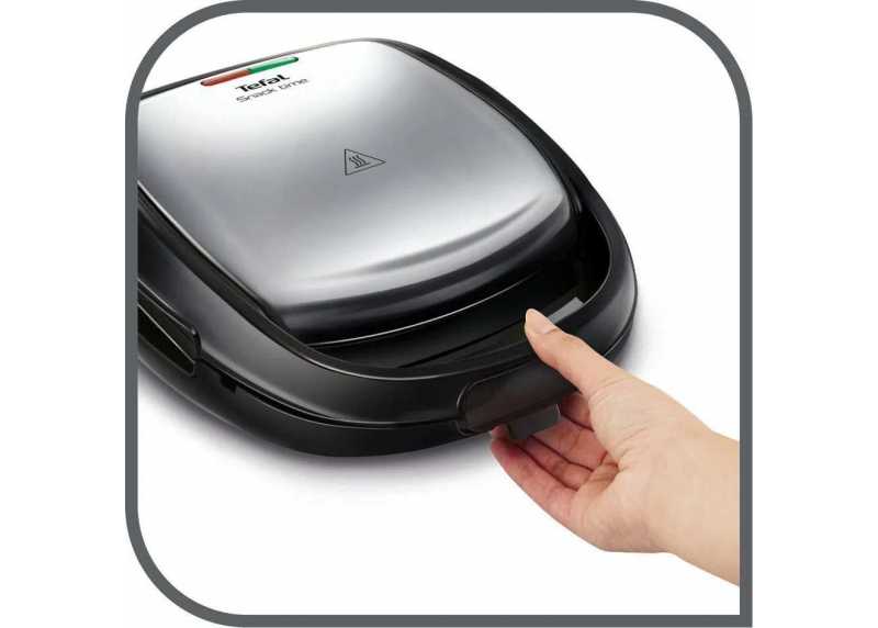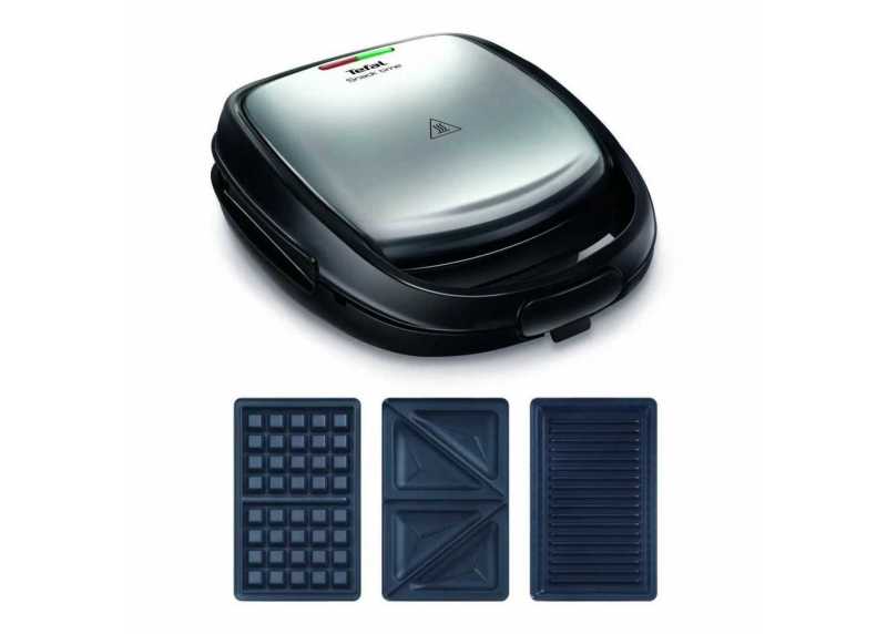 Sendvičovač Snack Time 3in1 od Tefalu zapéká trojúhelníkové sendviče a panini, griluje menší kousky masa a sýr a peče vafle. To vše na třech výměnných deskách s nepřilnavým povrchem, které jde jednoduše omývat v myčce. Madlo je tepelně odizolováno, abyste se nemuseli bát popálení při otevírání sendvičovače. Pro správné zapékání je na něm i zarážka, aby obě poloviny držely u sebe. Sendvičovač stojí na čtyřech pogumovaných nožkáých, které brání jeho klouzání po lince. Integrované tlačítko napájení šikovně nahrazuje nutnost pokaždé vytahovat sendvičovač po skončení ze zásuvky.