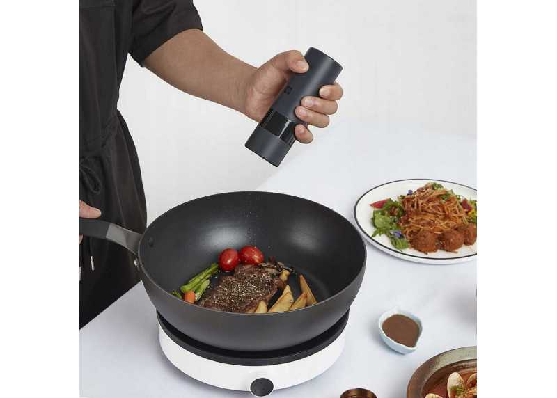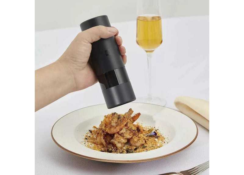 Elektrický mlýnek na koření je složen z keramické mlecí části a plastového těla ABS v matném provedení. Průhledný průzor usnadňuje kontrolu nad docházejícím kořením. Mlýnek mele v pěti stupních hrubosti bylinky, koření, sůl a pepř. Záleží na vás, co do něj nasypete. Je odolný a při mletí tichý, vyluzuje pouze 68 dB. Snadno se čistí a nepodléhá korozi. Při mletí svítí.