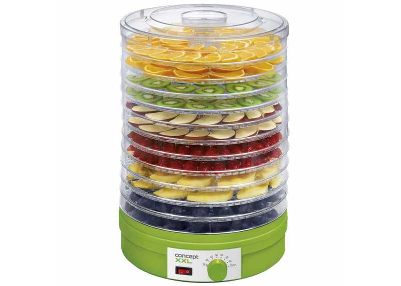 Sušička potravin Concept SO1025 pomůže uchovat úrodu a mít zdravé mlsání po celý rok. Suší šetrně, takže v ovoci, zelenině, houbách i bylinkách zůstává vysoký podíl vitaminů a minerálů. Využijete ji také na maso, ryby, těstoviny, květiny a pamlsky pro domácí mazlíčky. Pro velké dávky je jako stvořená: v balení je 12 velkých sít o průměru 32 cm, takže připravíte zásoby na delší dobu. Ovládání je jednoduché, potraviny rozložíte a nastavíte teplotu, zbytek proběhne automaticky.