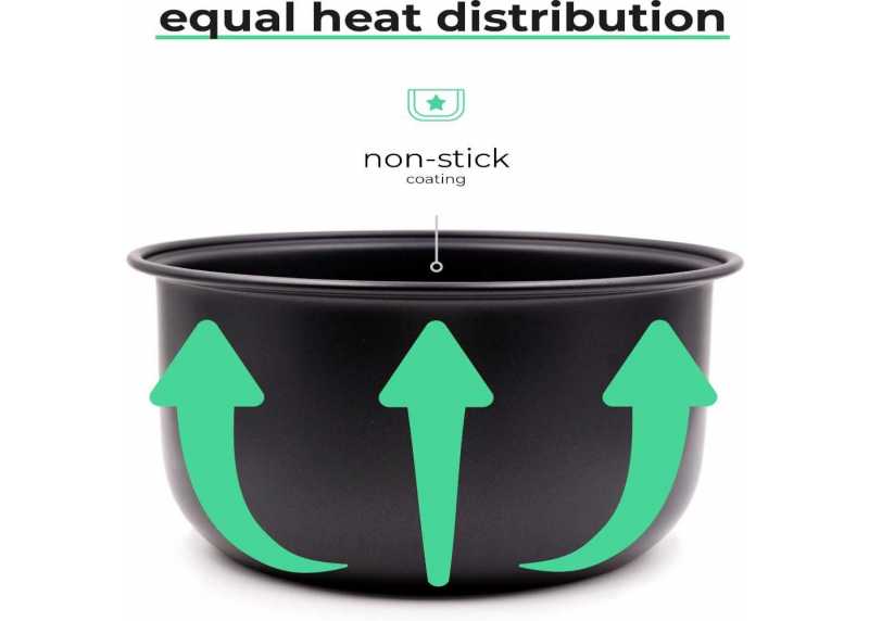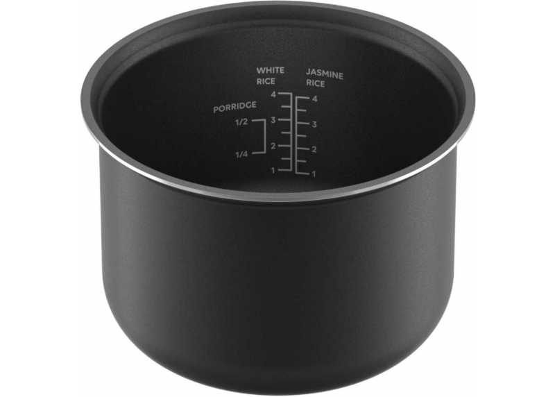 Vyjímatelná hliníková nádoba s nepřilnavým povrchem zajišťuje rovnoměrné vaření rýže bez připálení a zároveň se velmi snadno čistí. Součástí je i praktické příslušenství pro pohodlnou manipulaci s hotovým pokrmem.