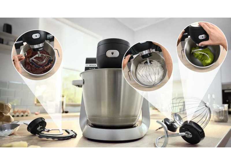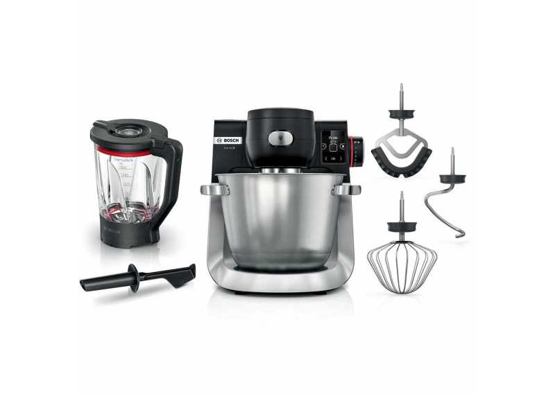 Kuchyňský robot Bosch MUM Serie 6 1600 W; 3D planetární hnětení; objem mísy 5,5 l; 7 rychlostí; integrovaná váha; šlehací metla, míchací metla, hnětací hák, průhledný kryt mísy, mixér, pěchovátko