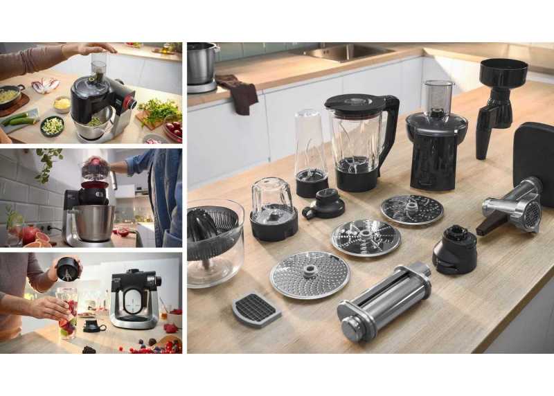 Barevné rozlišení příslušenství usnadňuje jejich správné připojení k robotu, což eliminuje zmatek a zrychluje proces přípravy pokrmů. Tato intuitivní funkce zvyšuje uživatelský komfort a efektivitu práce v kuchyni. K robotu můžete přikoupit celou řadu rozmanitého příslušenství. Kromě skleněného mixéru v balení můžete dokoupit třeba mlýnek na maso nebo kráječ na zeleninu.