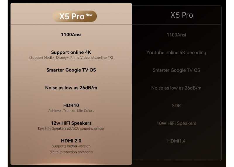 Vylepšený model X5 Pro new edition přináší nativní rozlišení 1920×1080 a zároveň online podporu 4K rozlišení pro streamovací služby jako je Netflix, Disney+, Prime a další. Projektor je kompatibilní s chytrými telefony, počítati, notebooky, tablety, USB disky a herními konzolemi. V sobě má zabudovaný operační systém Android TV 11, který vám umožní sledovat streamovaný obsah z vašich oblíbených aplikací a služeb, včetně instalování nových alikací. Díky dvojici integrovaných reproduktorů nemusíte k projektoru připojovat externí přehrávače. Kvalitní obraz v živých barvách s vysokým kontrastem a podporou HDR10 je ideální jak pro večerní sledování filmů, tak i pro kancelářské prezentace.