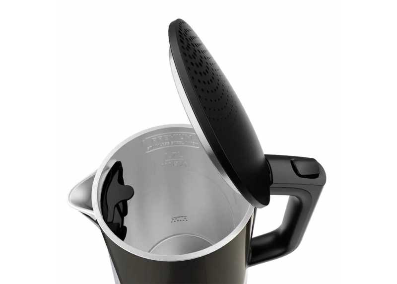 Rychlovarná konvice Tefal v černém provedení. Dotykové ovládání, 5 variant nastavení teploty, dvojitý plášť, objem 1,7 l, výkon 1800 W, vyjímatelný filtr.
