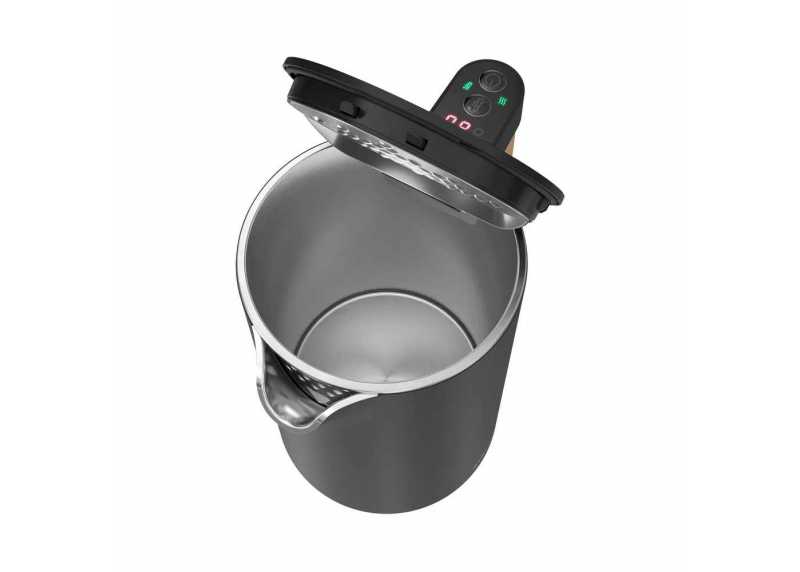 Elegantní design doplňuje rukojeť v imitaci dřeva. Nastavení teploty se provádí tlačítkem na rukojeti a aktuální teplota se zobrazuje na displeji umístěném na jejím vrchu.