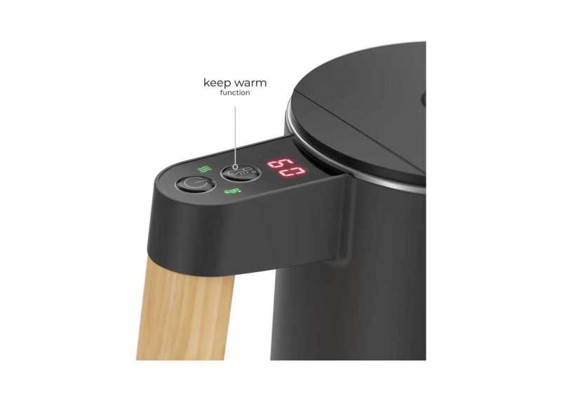 Konvice umožňuje aktivovat režim KEEP WARM – po ohřevu na zvolenou teplotu přejde do udržování a drží vodu ohřátou podle nastaveného režimu (maximálně až 8 hodin; režim nelze zvolit pro 100 °C). O bezpečný provoz se stará automatické vypnutí při dosažení nastavené teploty i ochrana proti chodu naprázdno.