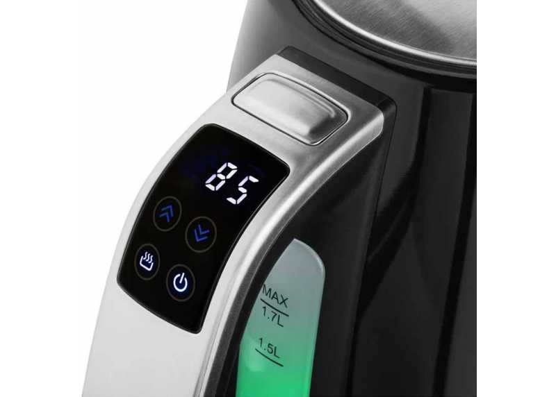 Rychlovarná konvice, ovládací displej, funkce udržení teploty vody, filtr proti vodnímu kameni, 1,7 l kapacita, výkon 2200 W.