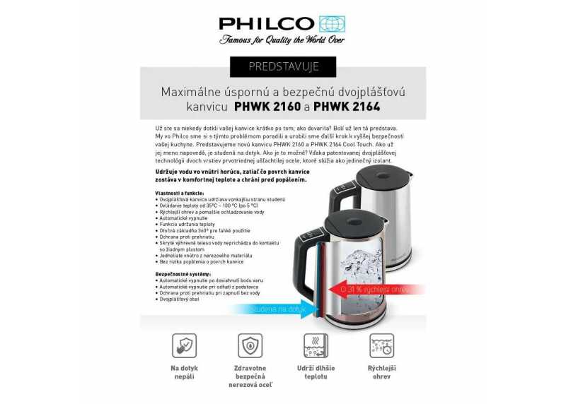 Představujeme rychlovarnou konvici Philco PHWK 1702. Spolehlivá a moderní rychlovarná konvice, která vám během chvilky připraví horkou vodu pro čaj, kávu či instantní pokrmy – ať už ráno spěcháte, nebo si chcete večer vychutnat šálek čaje u oblíbeného filmu, nebo knížky. Díky velkému objemu konvice 1,7 l uvaříte dostatek vody pro celou rodinu najednou. Skrytý topný element zajišťuje rychlý ohřev a snadnou údržbu, zatímco indikátor hladiny vody umožní přesné doplnění. Bezpečnostní funkce jako automatické vypnutí po dosažení varu a ochrana proti zapnutí bez vody přinášejí klid při každém použití. Elegantní a jednoduchý design skvěle doplní moderní kuchyni.