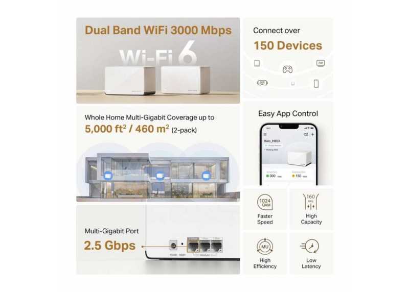 Mercusys Halo H85X (2-pack) je dvoupásmový Wi-Fi 6 Mesh systém s rychlostí až 2 976 Mbit/s a pokrytím až 460 m². Nabízí 3× LAN 1 Gbit, podporu až 150 zařízení, rodičovskou kontrolu a snadnou správu přes aplikaci.