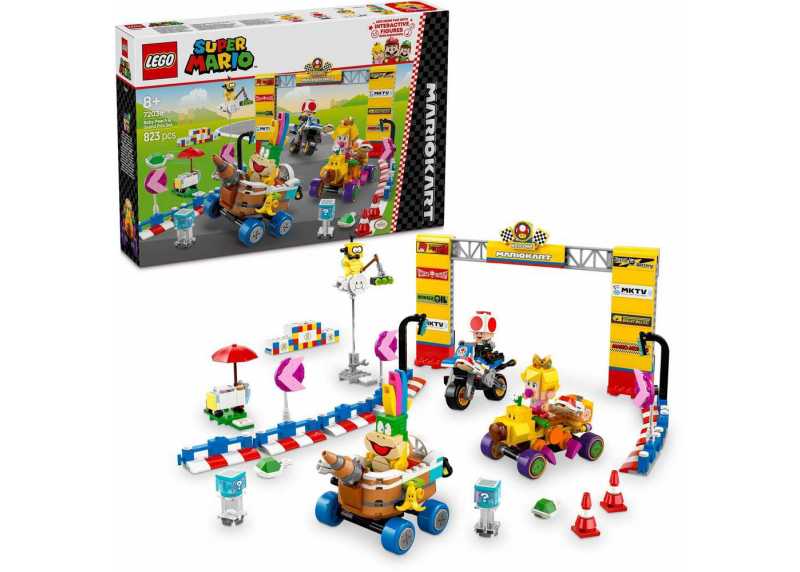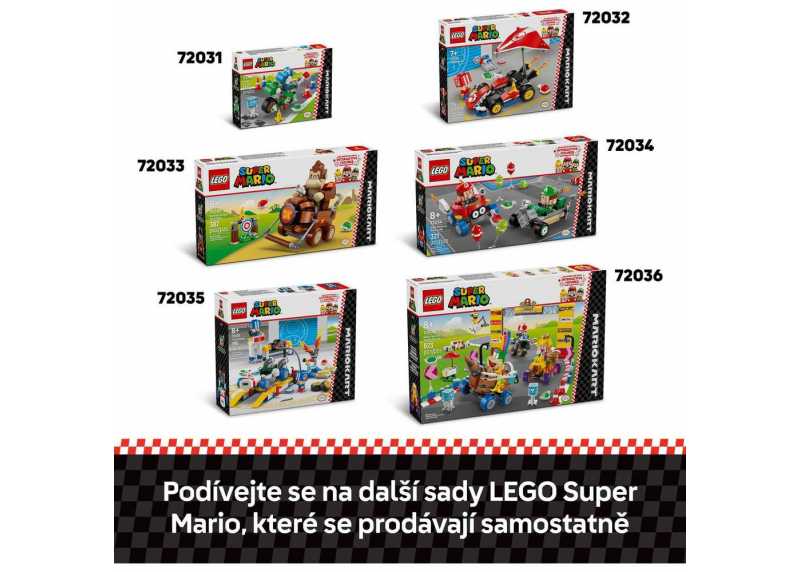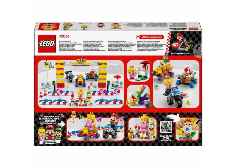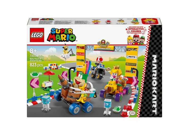 LEGO® Super Mario 72036 Mario Kart Baby Peach a sada Grand Prix. Akční závodní stavebnice s 823 dílky pro děti od 8 let inspirovaná světem Super Mario. Obsahuje závodní trať, vozidla, postavy a herní prvky. Rozměry modelu přibližně 33 × 18 × 4 cm.