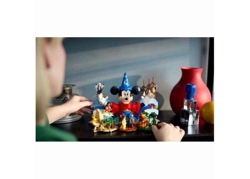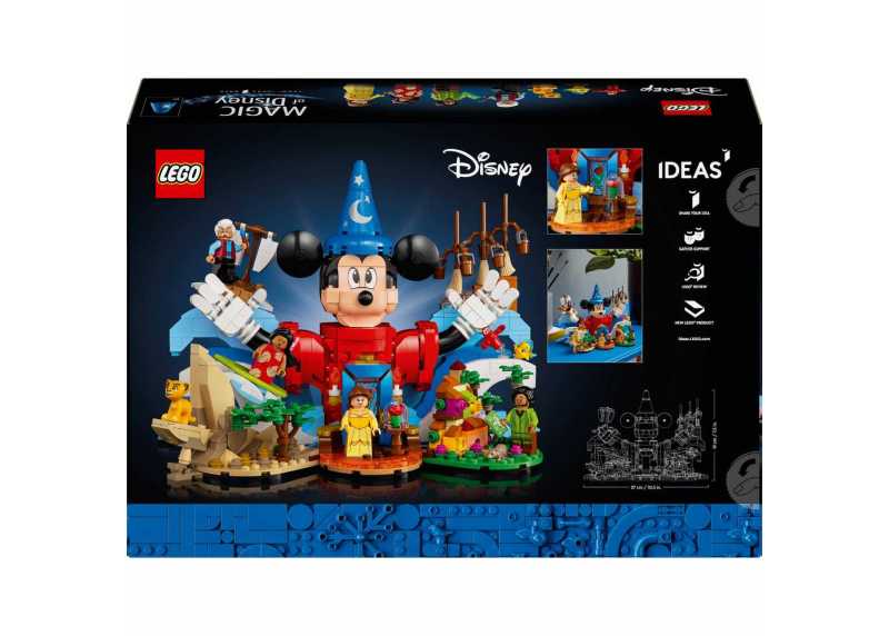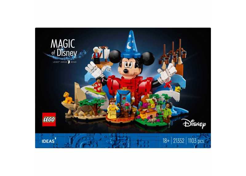 LEGO® Ideas 21352 Kouzlo Disney přináší jedinečný sběratelský model inspirovaný ikonickými scénami z oblíbených Disney filmů. Stavebnice je určena pro dospělé fanoušky a nabízí detailní zpracování, kreativní stavění i působivý výstavní výsledek. Dominantou je Mickey Mouse v roli čarodějova učně, doplněný o další známé postavy.