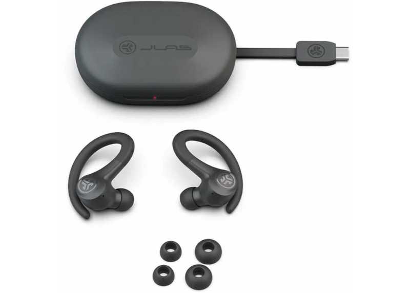 JLab Go Sport+ (Graphite) – bezdrátová sportovní True Wireless sluchátka za uši s mikrofonem. Bluetooth 5.1, AAC/SBC, ovládání na sluchátkách, IPX5, výdrž až 32 h, nabíjení USB-C.