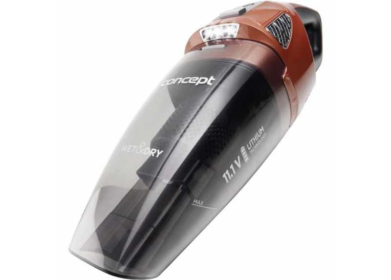 Ruční aku vysavač Concept VP4360 WET & DRY je vhodný na mokré i suché čištění všech typů podlah. Nabízí provoz až 45 minut, HEPA filtr, nádobu o objemu 0,45 l, LED osvětlení a praktický držák na zeď.
