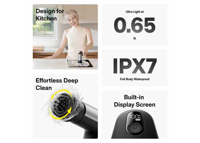 Ideální pomocník na zaschlé skvrny do kuchyně má hned několik kartáčových a houbičkových nástavců, aby se vypořádal s veškerou špínou. Podsvícená obrazovka vám poskytne přehled, kolik baterie zbývá, a dva rychlostní režimy ECO a MAX zastanou každodenní úklid i náročné drhnutí. Díky voděodolnosti IPX7 jej můžete celý čistit pod vodou, nebo jej využít ve dřezu, kde zrovna teče voda. Magneticky přichytávané nástavce se rychle vyměňují. Kartáč a jeho nástavce využijete při čištění kuchyňské linky, varné desky, dřezu, nádobí a dalších úklidových činnostech. Kartáč se točí rychlostí až 400 otáček za minutu a vydrží běžet až 110 minut. Díky malým kompaktním rozměrům se vejde i do stísněnějších prostor a pohodlně se drží v ruce.