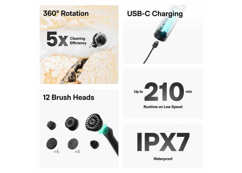 Ruční elektrický čisticí kartáč Wand Cordless Spin Scrubber pro čištění spár a úzkých prostor. 12 nástavců, výdrž 210 minut, nabíjení USB-C, voděodolnost IPX7, 250 otáček za minutu.