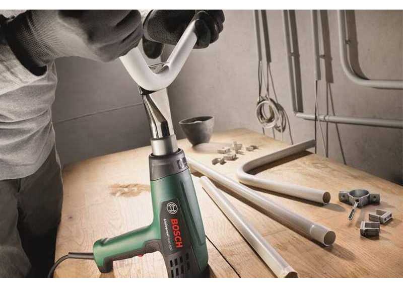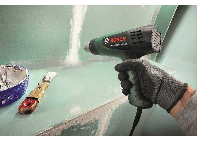 Horkovzdušná pistole BOSCH UniversalHeat 600 k odstraňování starých nátěrů, nalepování smršťovacích fólií a připevňování pásek, stupně teploty 50/300/600 °C a proud vzduchu 200/350/500l/min, příkon 1800 W.