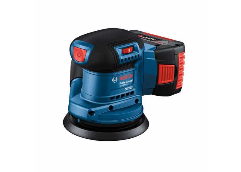 Akumulátorová excentrická bruska Bosch Professional GEX 185-Li s bezuhlíkovým motorem, průměrem kotouče 125 mm a hmotností 0,9 kg. Součástí balení je 1× akumulátor 18 V Professional, nabíječka a příslušenství pro profesionální použití.
