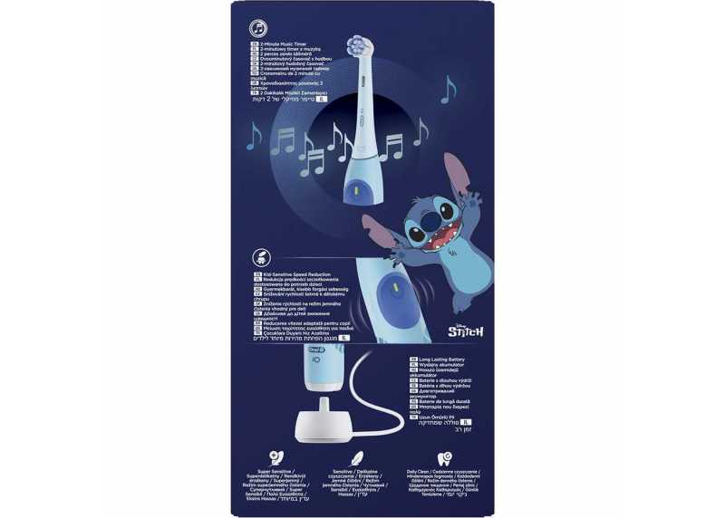 Oral-B iO Kids Disney Stitch je dětský elektrickýzubní kartáček, který spojuje šetrnou péči o zuby s motivací v podobě oblíbené postavičky. Jemná iO technologie účinně odstraňuje plak a zároveň chrání citlivé dětské dásně. Lehká konstrukce, malá hlavice a jednoduché ovládání zajišťují pohodlné čištění i pro nejmenší. Kartáček děti vede k doporučené délce čištění díky zabudovanému časovači a motivuje je ke správným návykům. S výměnnými nástavci a hravým designem je tento model skvělou volbou pro každodenní péči o zdravý dětský úsměv.