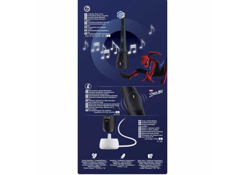 Oral-B iO Kids Marvel Spiderman je dětský elektrický zubní kartáček, který spojuje šetrnou péči o zuby s motivací v podobě oblíbené postavičky. Jemná iO technologie účinně odstraňuje plak a zároveň chrání citlivé dětské dásně. Lehká konstrukce, malá hlavice a jednoduché ovládání zajišťují pohodlné čištění i pro nejmenší. Kartáček děti vede k doporučené délce čištění díky zabudovanému časovači a motivuje je ke správným návykům. S výměnnými nástavci a hravým designem je tento model skvělou volbou pro každodenní péči o zdravý dětský úsměv.