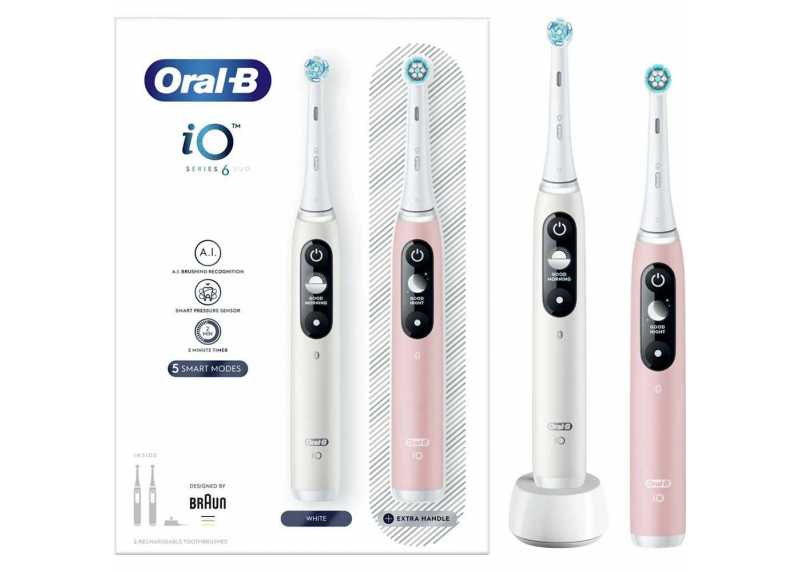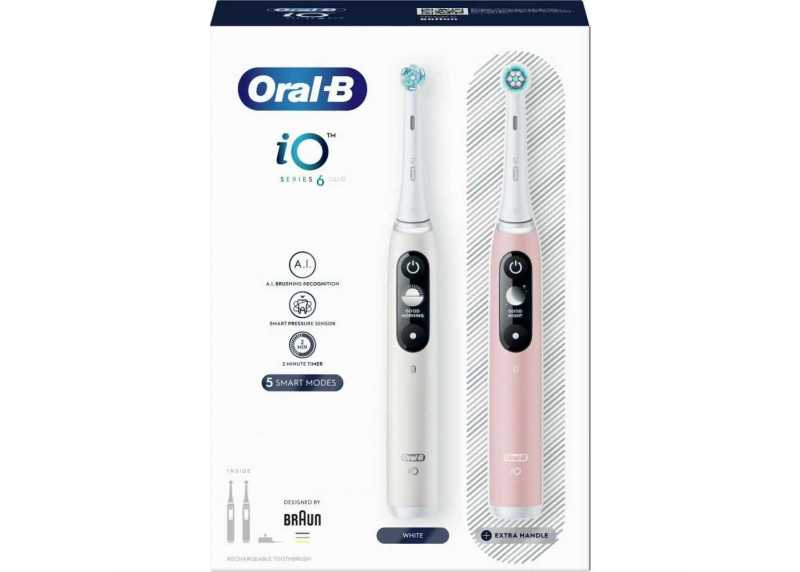 Elektrický rotační zubní kartáček iO Series 6 v bílé a růžové variantě s 5 režimy čištění, tlakovým senzorem, umělou inteligencí, indikátorem baterie, 1 náhradní hlavicí.