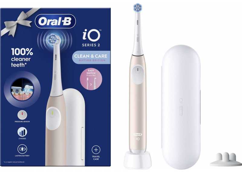 Elektrický rotační zubní kartáček Oral-B iO 2 v růžové variantě s pouzderm, 3 režimy čištění, tlakovým senzorem, časovačem, indikátorem baterie, 1 náhradní hlavicí.