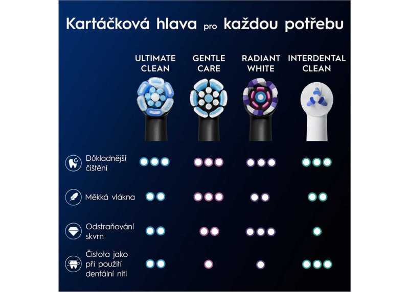 Náhradní hlavice pro rotační kartáčky Oral-B iO Ultimate Clean. Hlavice Oral-B iO Ultimate Clean efektivně a bezpečně odstraňuje zubní plak. Je speciálně navržená, aby spolupracovala s kartáčky iO na co nejlepším zážitku z vyčištěných zubů. Kulatý tvar hlavice umožní optimálně obklopit zub pro co nejlepší vyčištění. Doporučujeme měnit hlavice každé 3 měsíce.